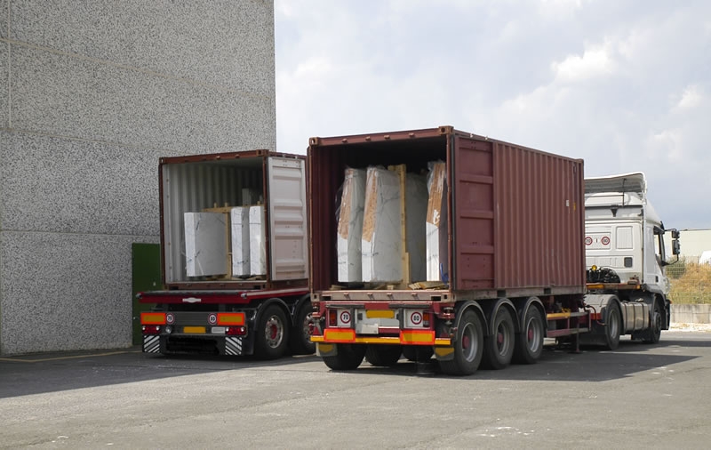 I nostri prodotti, siano essi lastre, marmette, blocchi, semiblocchi o informi, vengono spediti all’estero via mare dopo essere stati caricati su container. Le lastre hanno bisogno di un imballo specifico, detto ‘legaccio’: si tratta di una “gabbia” di legno all’interno della quale le lastre sono saldamente fissate, appoggiate tra loro e separate da un foglio di nylon a proteggere la faccia lavorata (lucida o levigata).