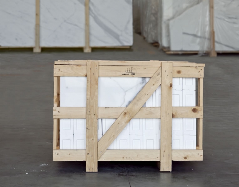 Anche le marmette, imballate in casse di legno, vengono puntellate all’interno del contenitore prima della spedizione, mentre per i blocchi si utilizzano piccoli ritagli di legno come ‘zeppe’ da inserire in corrispondenza delle irregolarità degli stessi.