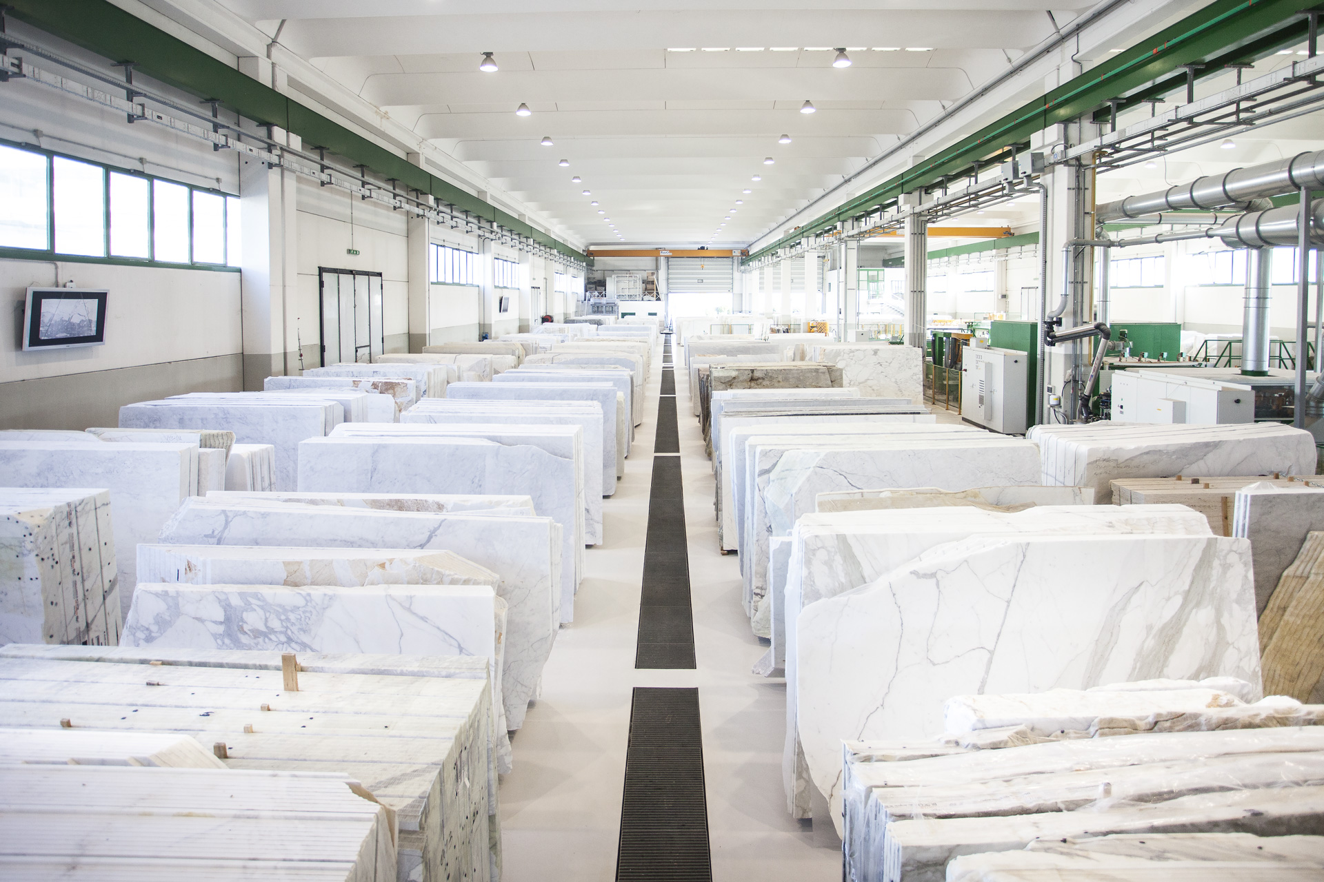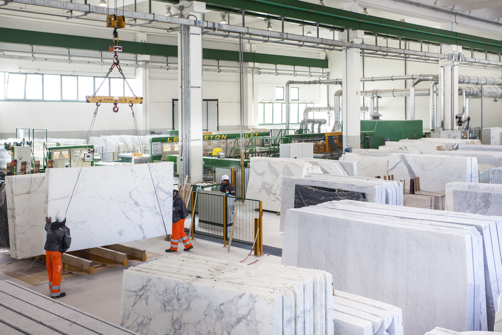 Qui, nella manifattura, macchine classiche e di nuova generazione provvedono a trasformare i marmi della cava, quando i difetti lo consentono, in altre forme : le lastre, che sono la specialità principale della nostra filiera. Uomini e donne della manifattura provvedono al ciclo produttivo e amministrano la diffusione internazionale dei marmi bianchi e colorati lavorati.