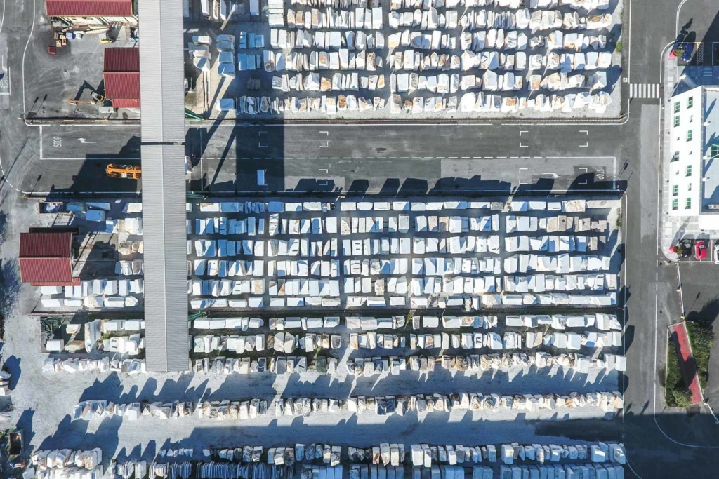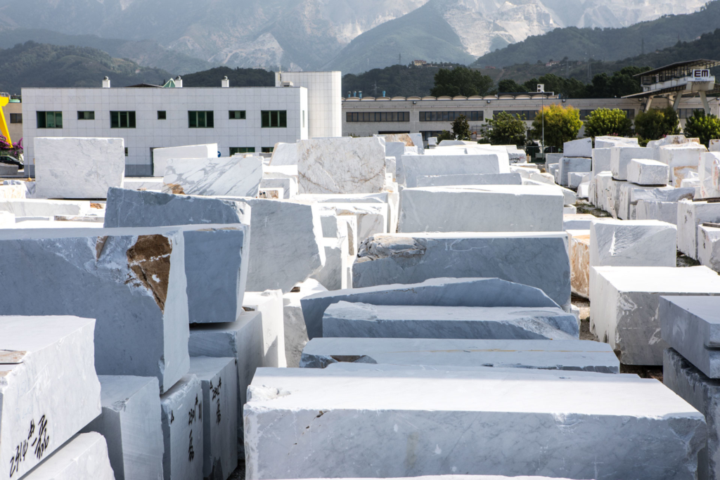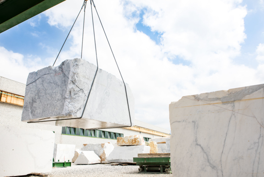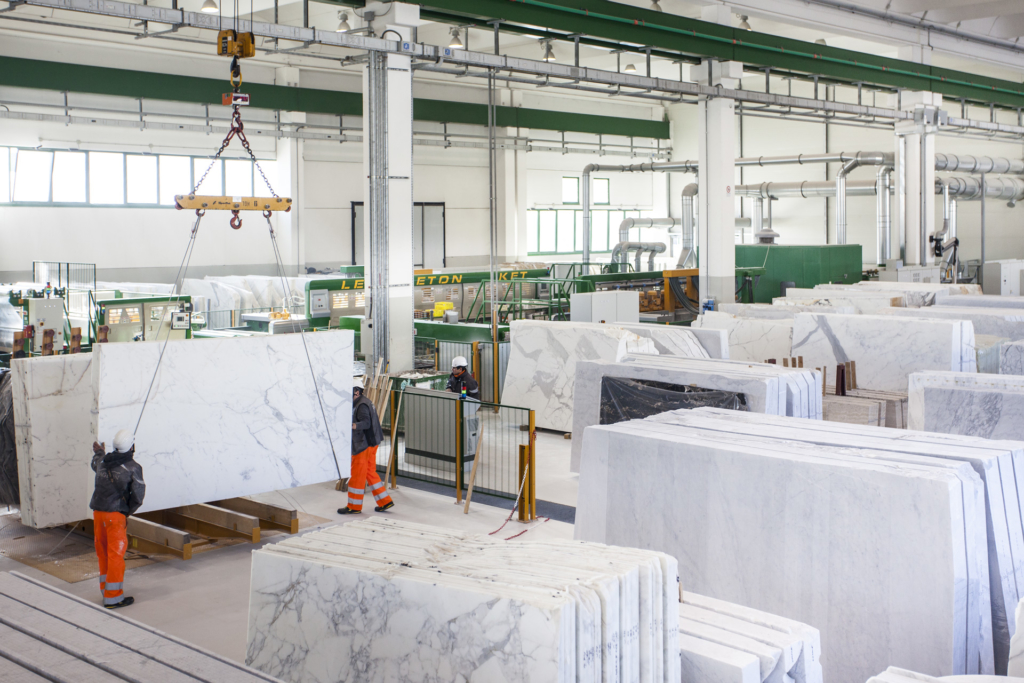 Dalla cava i camion portano i marmi, con le loro forme, alla manifattura della filiera.