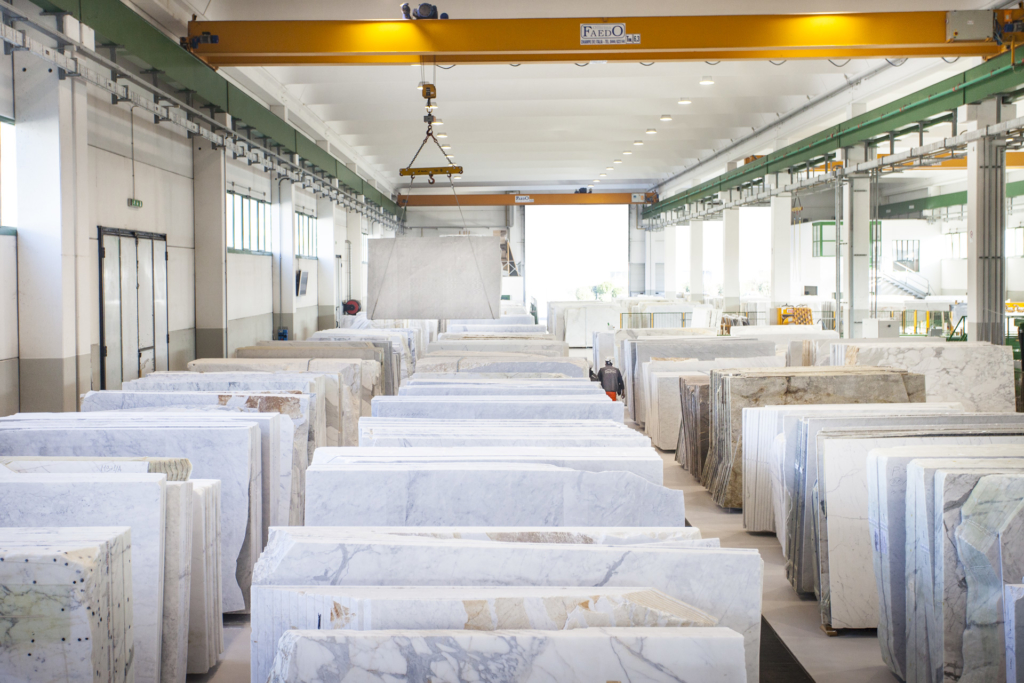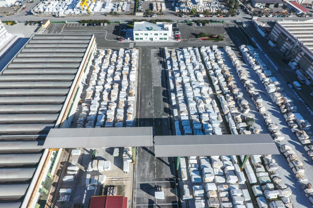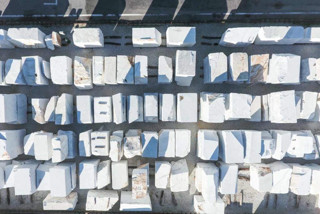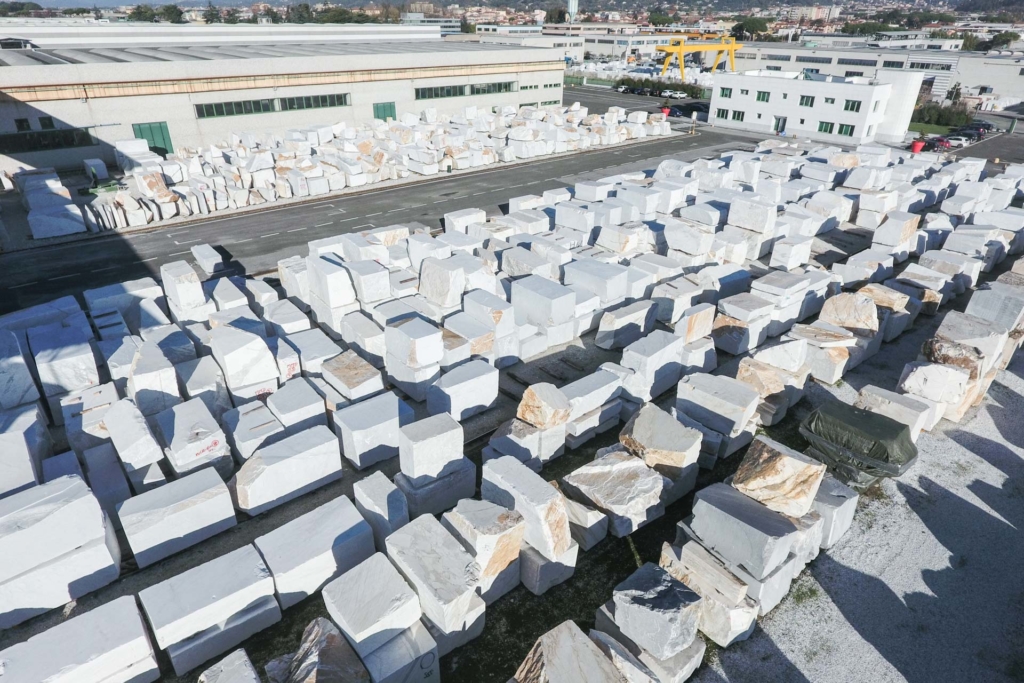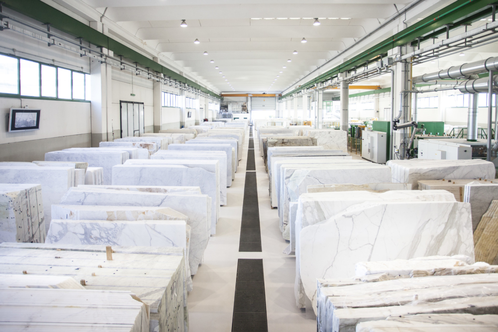 Dalla cava i camion portano i marmi, con le loro forme, alla manifattura della filiera.